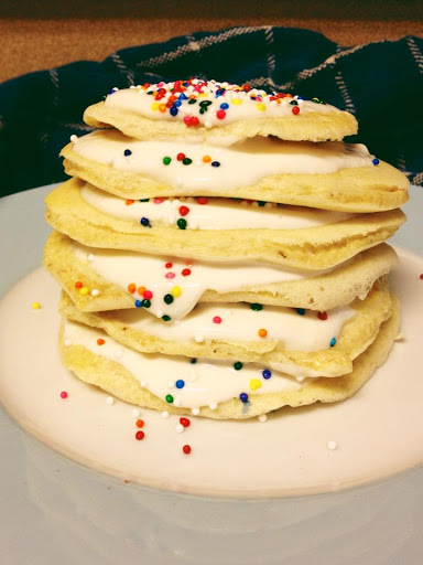 Blend well. It was a very thick batter, and I spooned it onto my griddle and cooked like normal pancakes. The frosting is vanilla greek yogurt mixed with a little almond milk and vanilla extract. I also added these birthday-ish sprinkles that are okay to eat from Central Market.