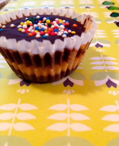 I used my mini muffin liner and pan, and melted down the ingredients for the chocolate in my nonstick pan. I spooned the chocolate into the liners, stuck the pan in the freezer for 8 minutes, and then added the PB and second layer of chocolate. I froze them for another twenty minutes.