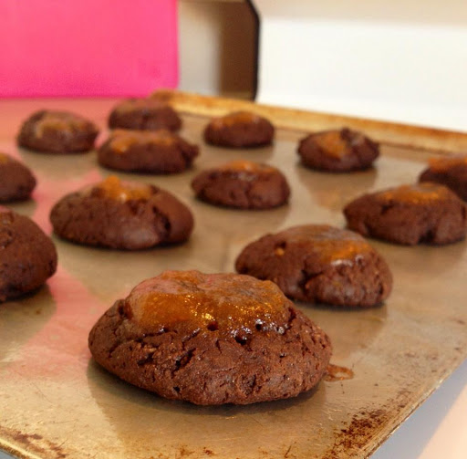 This week I made a cookie recipe that Scott has been wanting me to make since it really was pumpkin season! I made dark chocolate cookies with pumpkin on top. They’re a recipe from Chocolate Covered Katie, which is my favorite dessert blog. This is her recipe, except I didn’t do them inside out…