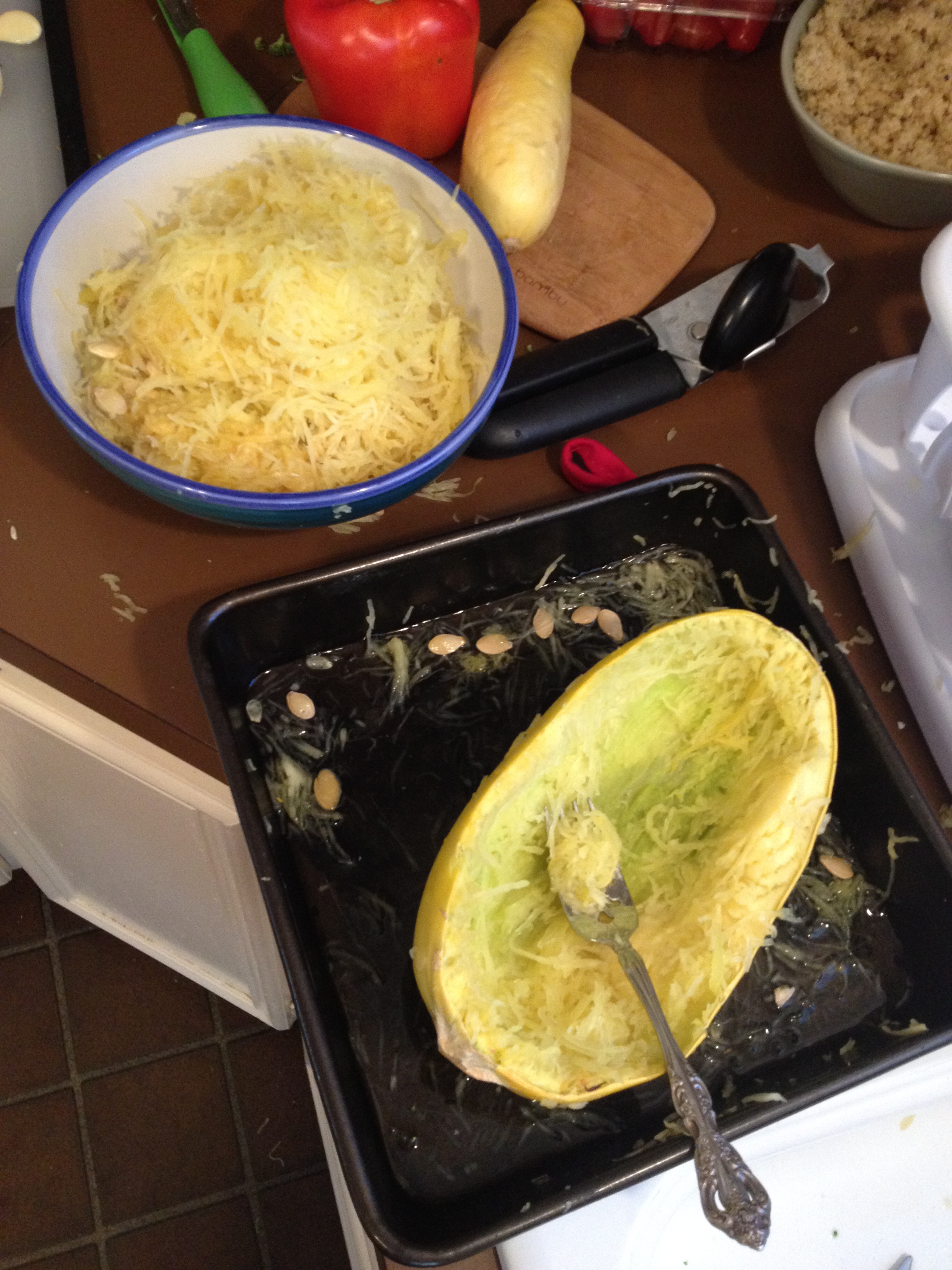 I don’t care who you are or how you feel about vegetables- never forget to scoop the seeds out of a squash before attempting to prepare it. My life was a nightmare for almost thirty five minutes while I HAND PICKED seeds out of Rose’s “spaghetti.”
