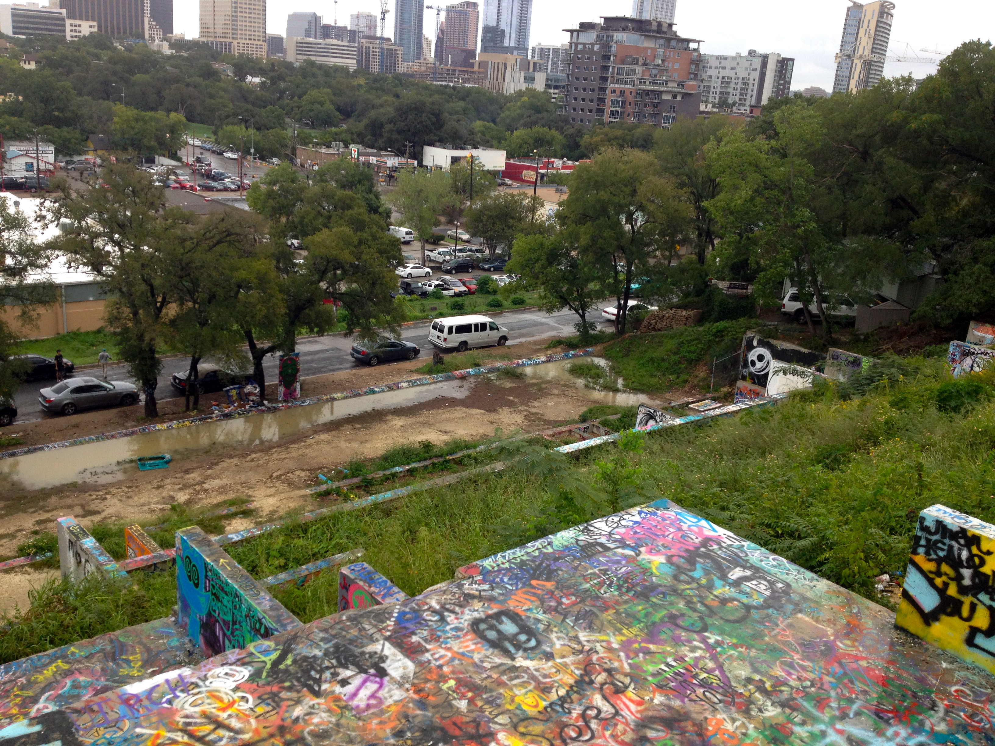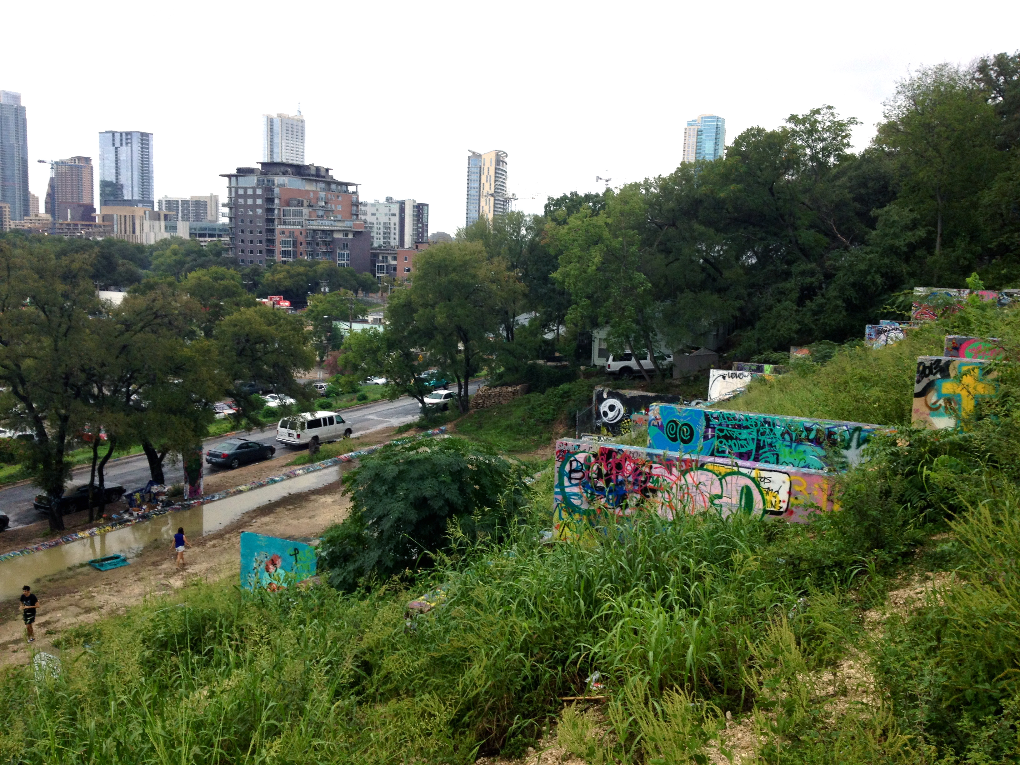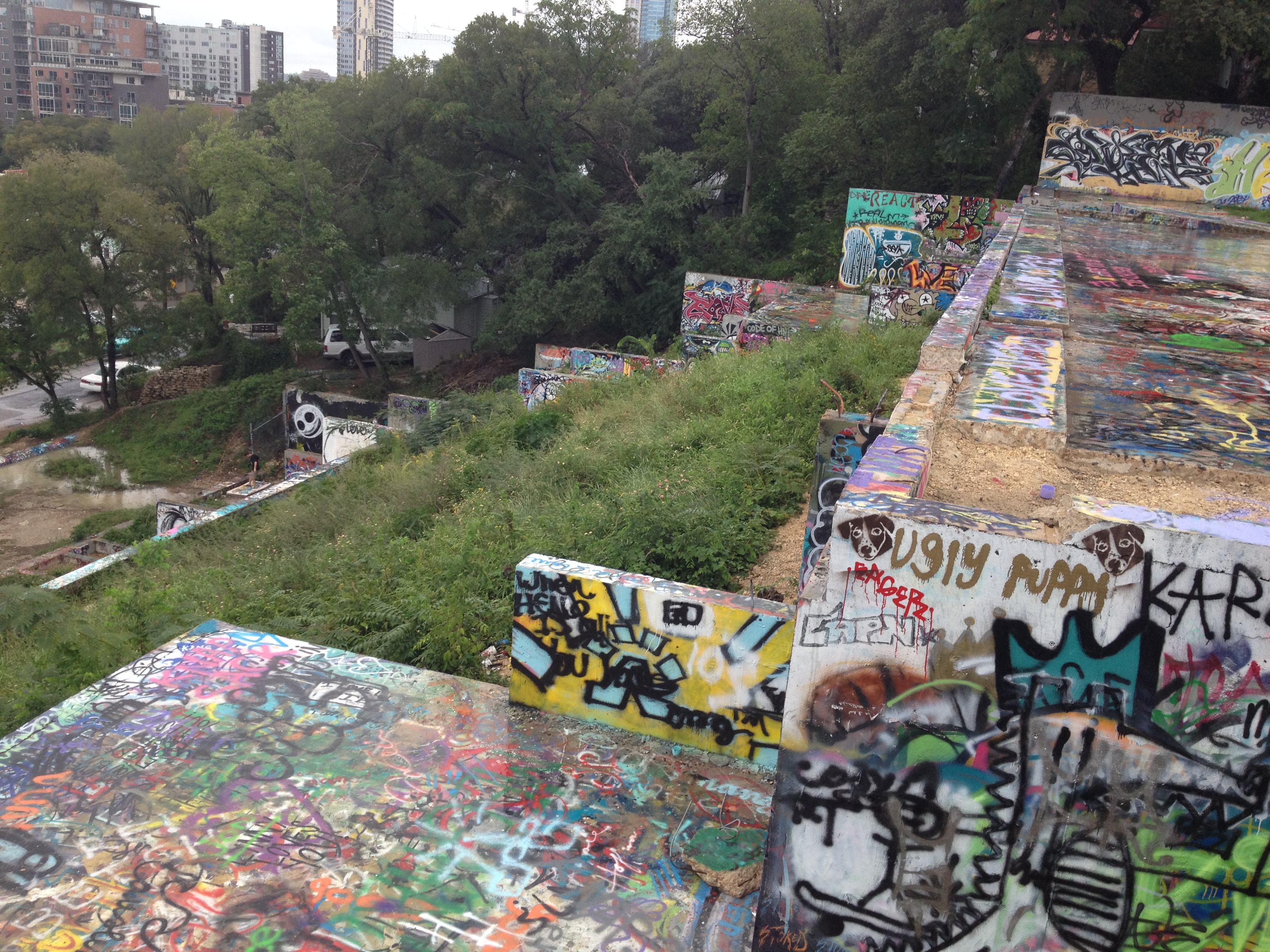 I have lived in Austin for four years and still gaze in wonderment at Town Lake and our city skyline, but I’ve stopped noticing the artiness of our town. For instance, right downtown near the Whole Foods and the skate park and my boss’s house, there is a huge lot with lots of cement walls COVERED in graffiti.