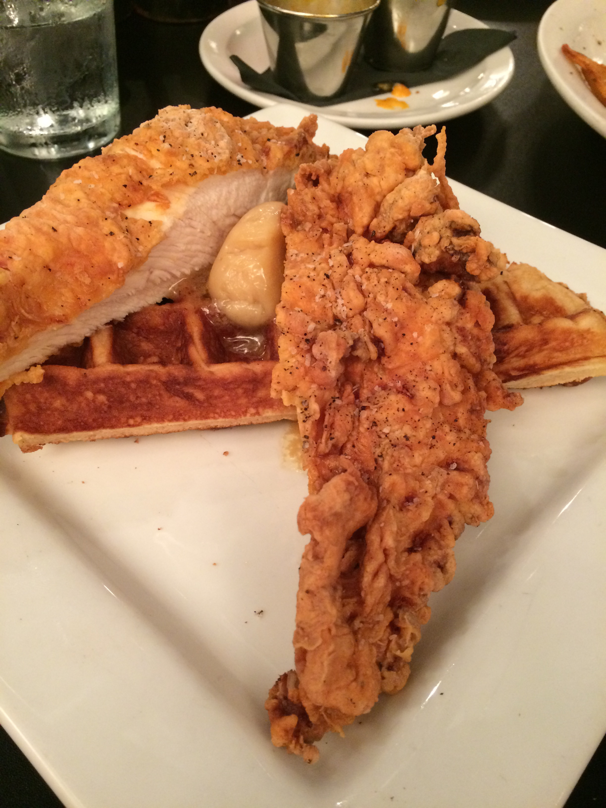 I ordered french fries with mustard and aioli dipping sauces, as well as chicken and waffles. I am a very healthy eater, so this was clearly an alcohol influenced decision!! Doesn’t that chicken and waffles look good? It had brown sugar butter and was an organic, locally sourced dish, because, hello, this is Austin!!