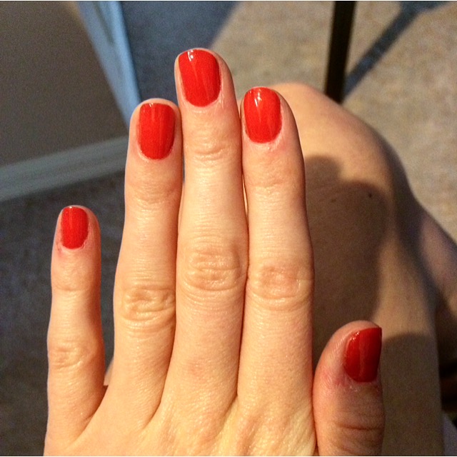 Fashion A Bow is quite simply the best red I’ve ever found. I have hunted for a great red for many years, and used to think OPI’s Big Apple Red was the winner. Some other notable reds I’ve tried are OPI’s What’s Your Poinsettia & Red Hot Rio and China Glaze’s Salsa. But once I found Fashion A Bow, I haven’t used anything else. Here is a photo of it on my nails: